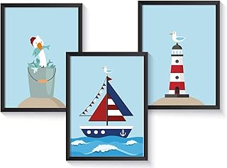 JONONOH Kinderzimmer Poster maritim, Bilder Babyzimmer maritim, A4 Poster Boot Leuchtturm Möwe Kinderposter