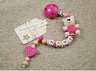 Baby SCHNULLERKETTE mit NAMEN - Schnullerhalter mit Wunschnamen - Mädchen Motiv Bär und Herz in pink