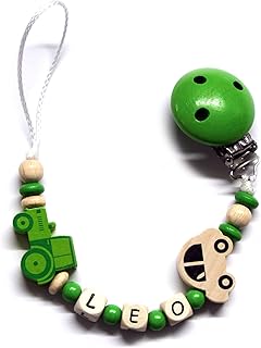 Baby Schnullerkette mit Perlen aus Holz und Wunschname. Grün mit Auto und Traktor (LEO)