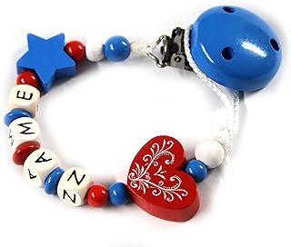 Baby Schnullerkette mit Perlen aus Holz und Wunschname. Bunt mit Herz